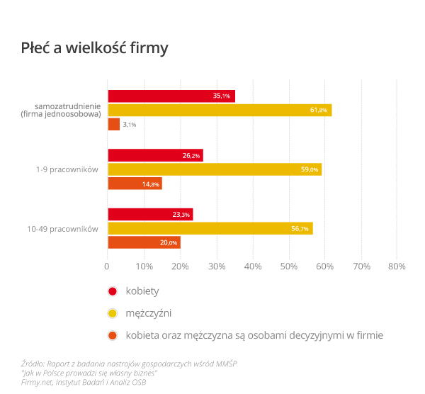 Biorąc pod uwagę zróżnicowanie na płeć osoby zarządzającej firmą, można stwierdzić, że mężczyźni dominują w Polsce wśród wszystkich form działalności (samozatrudnienie, mikro- i małe przedsiębiorstwa).