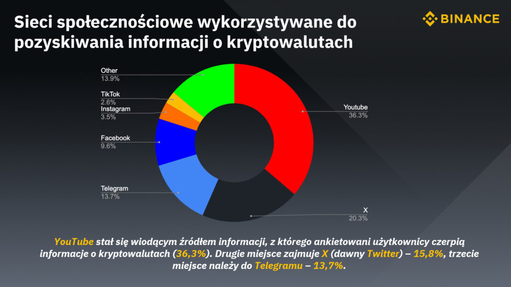 Głównym źródłem informacji na temat rynku kryptowalutowego jest dla nich internet (54.5%), a następnie znajomi lub rodzina (33.1%) oraz media społecznościowe (6%). Co ciekawe, wśród mediów społecznościowych, to YouTube jest wiodącym źródłem informacji na temat kryptowalut (36.3%), a następnie Twitter/X (15.8%) oraz Telegram (13.7%).