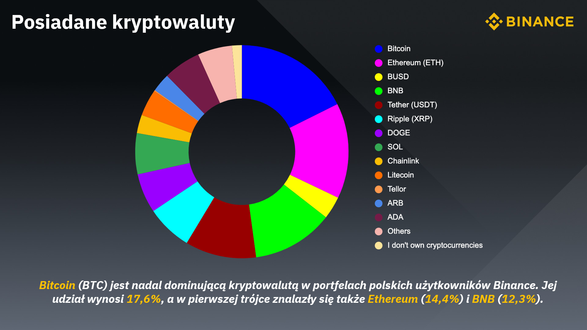 BTC jest nadal dominującym aktywem kryptowalutowym posiadanym przez polskich użytkowników Binance. Udział tej waluty w ich portfelu inwestycyjnym wynosi 17.6%, na drugim miejscu jest ETH (14.4%), a potem BNB (12.3%).