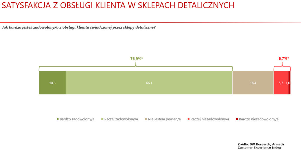 Najwyższe oceny poziomu satysfakcji z obsługi klienta można zaobserwować w handlu. Jeśli idzie o tradycyjne sklepy detaliczne, to ponad trzy osoby na cztery (77%) deklaruje zadowolenia ze standardu obsługi (bardzo – 11%, raczej – 66%). Odsetek osób niezadowolonych wynosi niemal 7% (bardzo – 1%, raczej – 6%). W przypadku e-commerce (w tym usług kurierskich) poziom zadowolenia z obsługi także wynosi 77%, przy czym wskazań na „bardzo zadowolonych” jest 19%, a „raczej zadowolonych” – 57%.